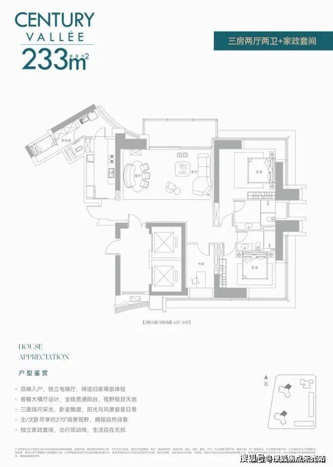 约233㎡3+1房3卫 A户型,西北朝向看名商和沙河高尔夫;