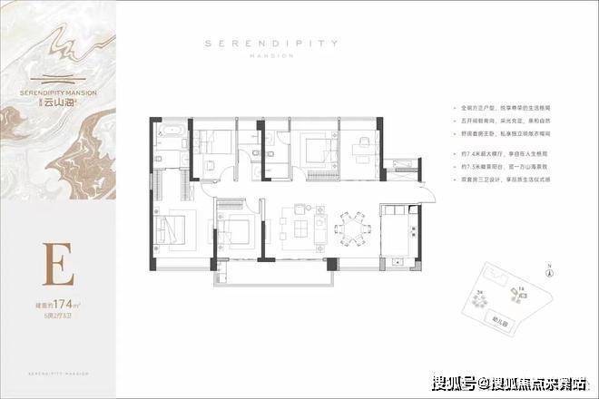 174㎡的5房2厅3卫:分布在1栋的01.02户型,设计的是横厅格局,客餐厅一体化7.4米开间,客厅连接次卧出大阳台(7.3米长),三开间朝南,全屋飘窗,双套房设计,卧室宽度分别为4/3.2/3/2.9/2.6米,U型厨房,公卫三段式分离,阳台主朝西南向。