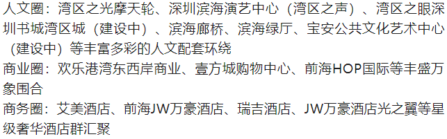 项目的生活配套包括一座湾区地标(欢乐港湾)、七大市政配套、两大城市公园、多家五星酒店、两大购物中心等。