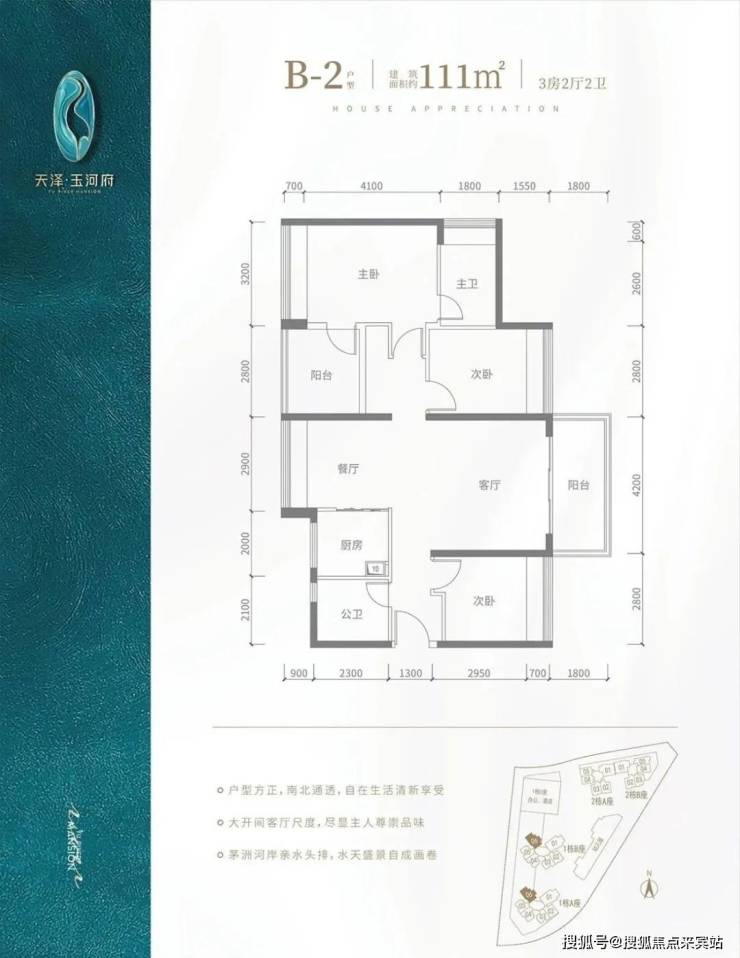 B2户型-111㎡-4房2厅2卫,设计的是竖厅南北通透格局,客厅4.2米开间,阳台主朝东北朝向,看花园景观,全屋飘窗设计。