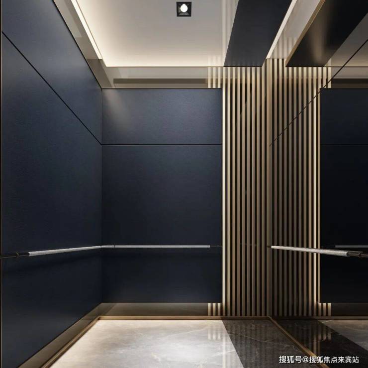 The elevator hall continues the rational order of the whole floor design, with dark wood grain, elegant gray stone and metal details outlining the ceremonial welcoming axis under the guidance of light bands; inside the car, the introverted dark blue leather and champagne metal grille form the interior quiet area, and the top line of light and mirror reflection form the flexible tension.