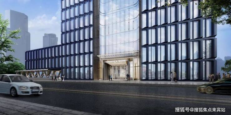 The overall façade of the building is wrapped in a dark blue metal frame, combined with embedded vertical glass windows to form a sequential texture, reinforcing the sense of rhythm and rhythm. The entrance area is guided by a double height glass curtain wall to provide a clear visual focus, while the internal vertical grille forms a visual guide path for the natural convergence of pedestrian flow. The top canopy uses a combination of light and transparent glass and metal components to create a “suspended” welcoming gesture. The overall language responds to the image of a high-end office building with a restrained contemporary compositional logic, presenting a rational, refined and powerful modern urban expression.
