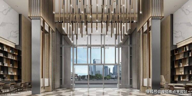 大面积通高落地玻璃窗将城市天际线如画卷般引入室内,形成内外交叠的视觉交汇。室内材质从接待区延续至书吧区域,通过木饰面、开放格架与艺术家具的布置,强化空间的社交属性与生活场景感。金属格栅与吊灯系统垂直错落,构建层次丰富的视觉透视体系,也为城市精神注入秩序化的“室内节奏”。