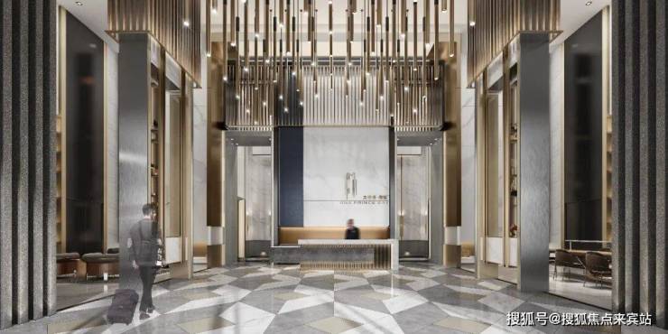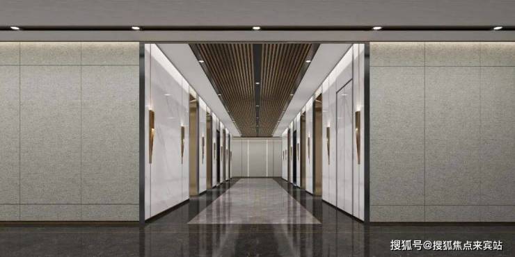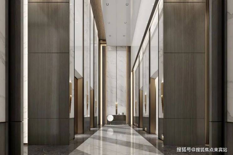 The symmetrical axis strengthens the spatial order, and the rhythmic tension is constructed with dark and light materials. The overall contrast between white stone, dark wood grain and metal outline is exquisite, and the ceiling adopts light curtain panel embedded lights to create a sense of sequence and ceremony. The lighting and wall metal lines echo vertically, releasing the rational aesthetics of the elevator hall as a high-class business venue in the midst of simplicity.