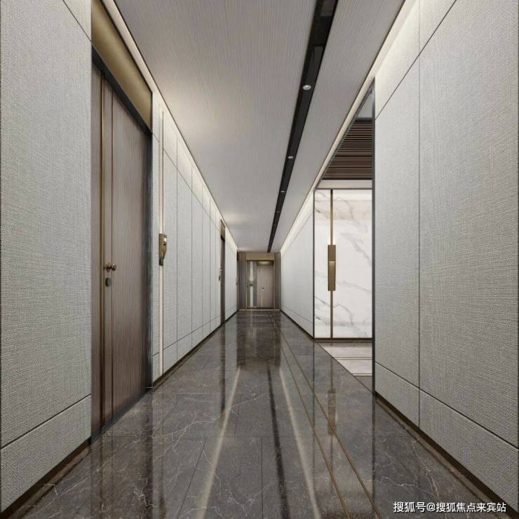 The design language of the standard floor common area is “minimalist order”, with textile wall panels, stone skirting and copper inlays, creating a restrained and gentle transition area. Linear light fixtures and light strips on the flooring form a guiding relationship, reinforcing the rhythm of movement. The dark wood leather entrance door combines with metal door cover and no main light to create a dignified and quiet homecoming ceremony. The aesthetics of the finishes are revealed in the rational order, and the passage space is elevated to a ceremonial and recognizable foyer system.