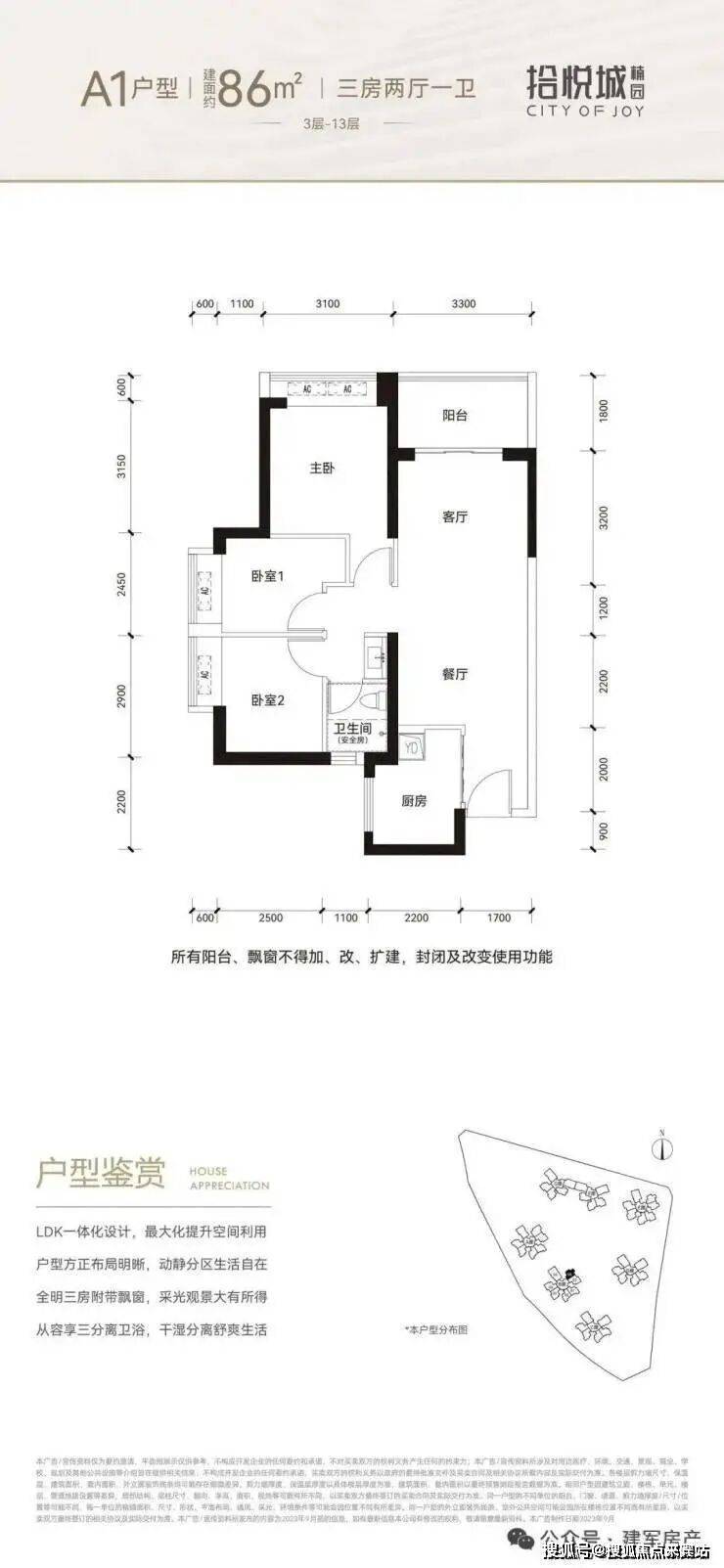 86平三房:设计的是竖厅格局,进门入户玄关,客厅3.3米开间,LDKB一体化设计,3个卧室分别做到了3.1米/2.9米/2.45米的宽度,U型厨房,卫生间三段式分离,得房率:76.92%(不含赠送),阳台1.8米宽度,东北朝向。