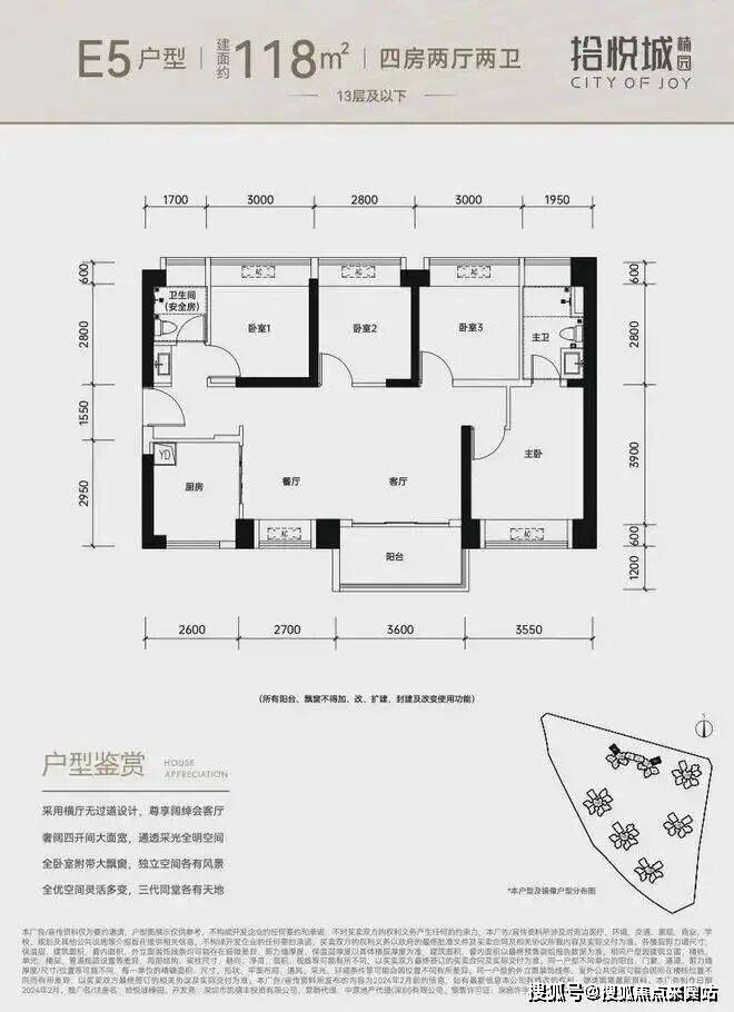 115平~118平全明采光户型,四卧室、厨房、两卫、客餐厅等均设计超大采光面,带来明亮通透的舒适居感,客餐厅以横厅布局,让家庭居住空间的视野范围和活动区域扩大,加强家庭成员之间的情感交流;不论是三代同堂的天伦之乐,亦或是四口之家的温馨时刻,皆能一步到位。