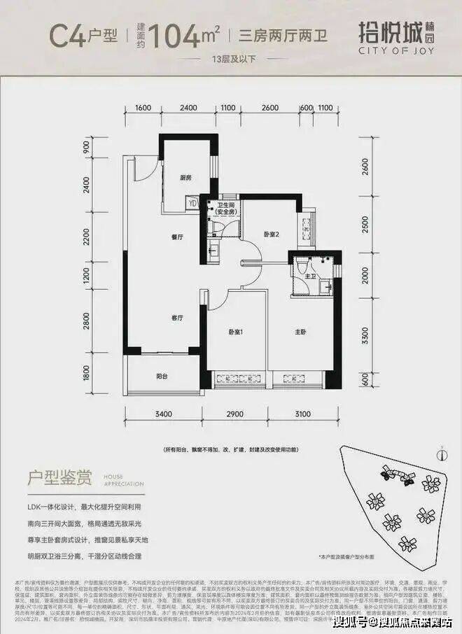 100平三房:设计的是竖厅格局,进门入户玄关,客厅3.4米开间,LDKB一体化设计,3个卧室分别做到了3米/2.9米/2.5米的宽度,U型厨房,公卫三段式分离,得房率:77.14%(不含赠送),阳台1.8米宽度,西南或东南朝向。