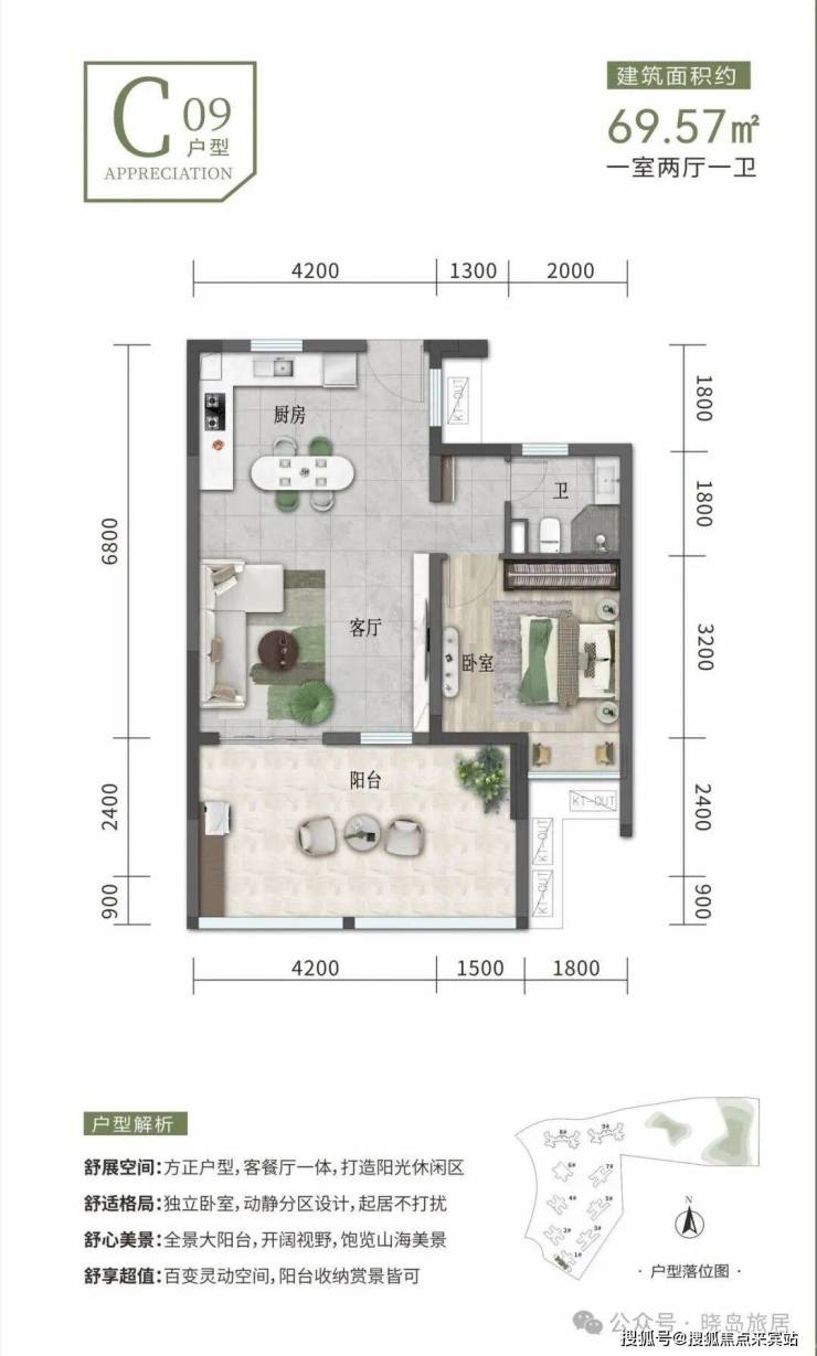 建筑面积约69-104㎡一至三房,方正开阔空间,户户阳台,动静分离,功能分区,厨房、阳台等多功能配套,全能居家,旅居休憩或家庭度假皆可。