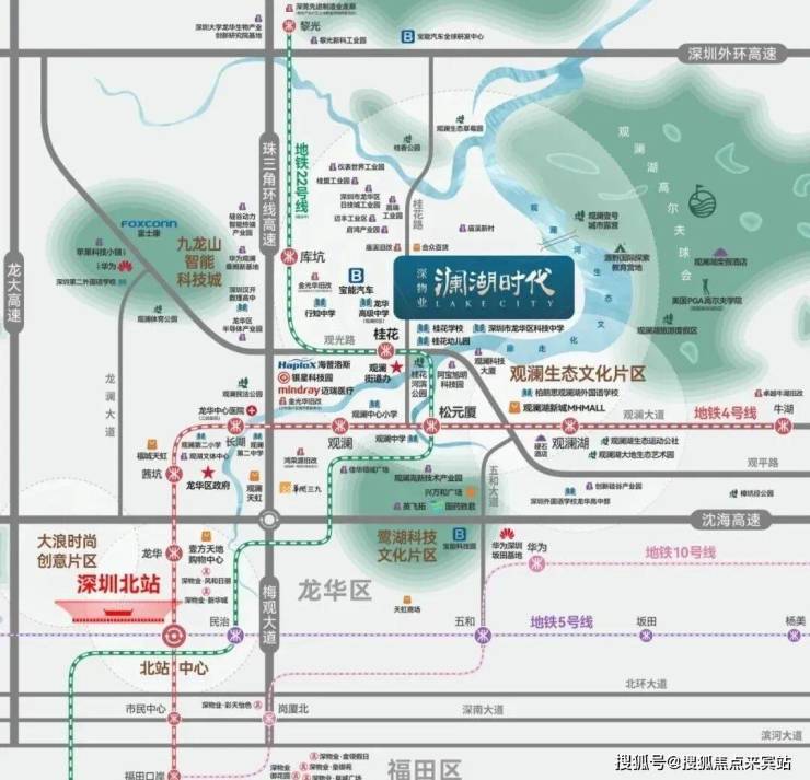 ●片区现有富士康、华润三九、长安标致雪铁龙等龙头企业入驻,华为将拟建76万㎡新能源大厂,迈瑞亦布局建设医疗器械标杆制造基地,观澜成为大湾区产业高地,高净值尖端人才涌入,就近置业需求井喷。