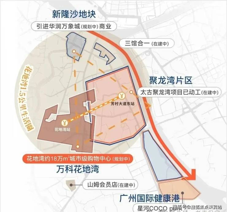 此外花地湾片区基本都是由万科统一开发,汇合白鹅潭-花地湾-聚龙组团的板块张力,白鹅潭核心区、聚龙组团、花地湾组团,于半径约2KM内构建珠江西岸CAZ黄金三极。