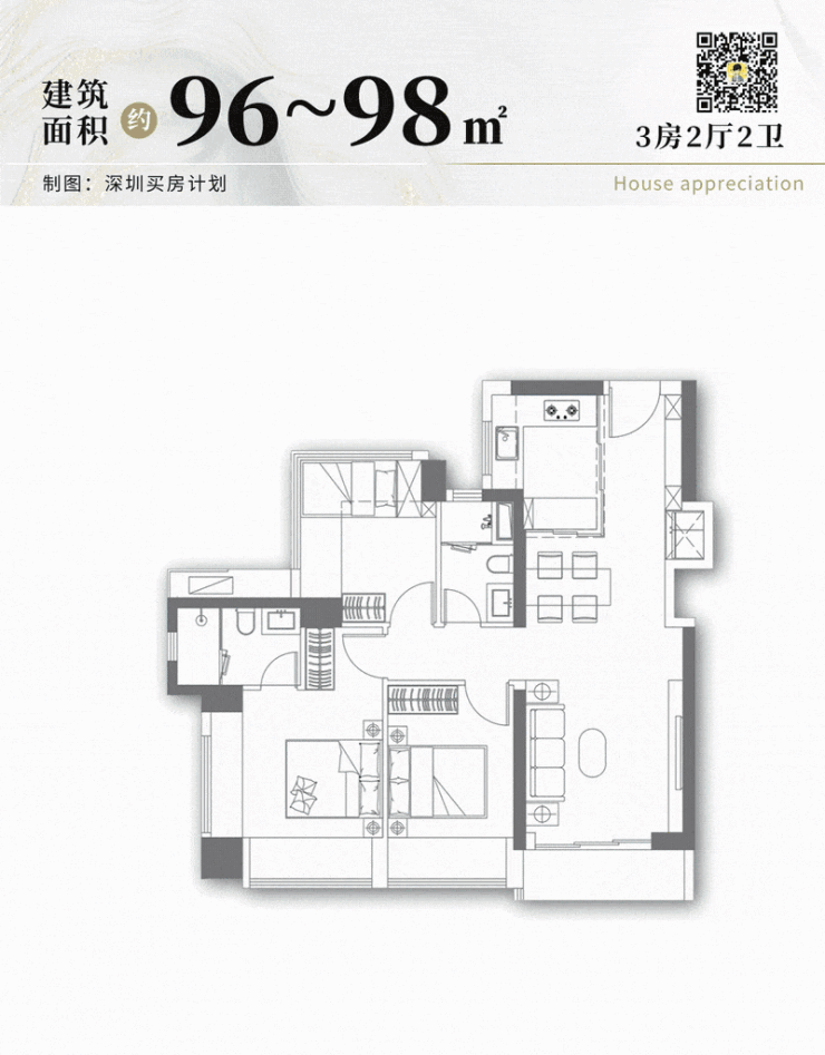 ◎ 建面约96-98㎡3房2卫: