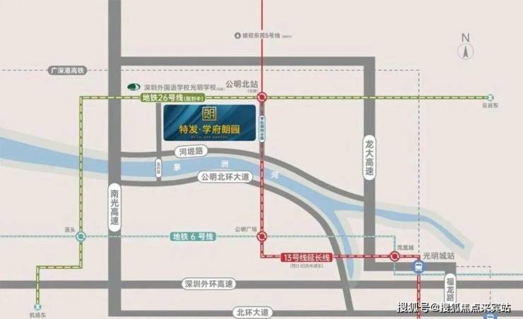 <交通>:项目距13号线二期(北延)李松蓢站距离约150米,3站达公明广场,开通后约30分钟可抵达南山核心区,45分钟可达深圳湾口岸;