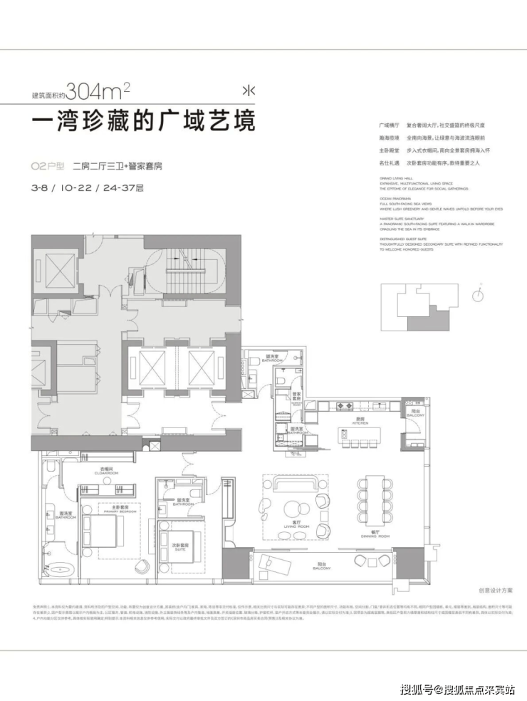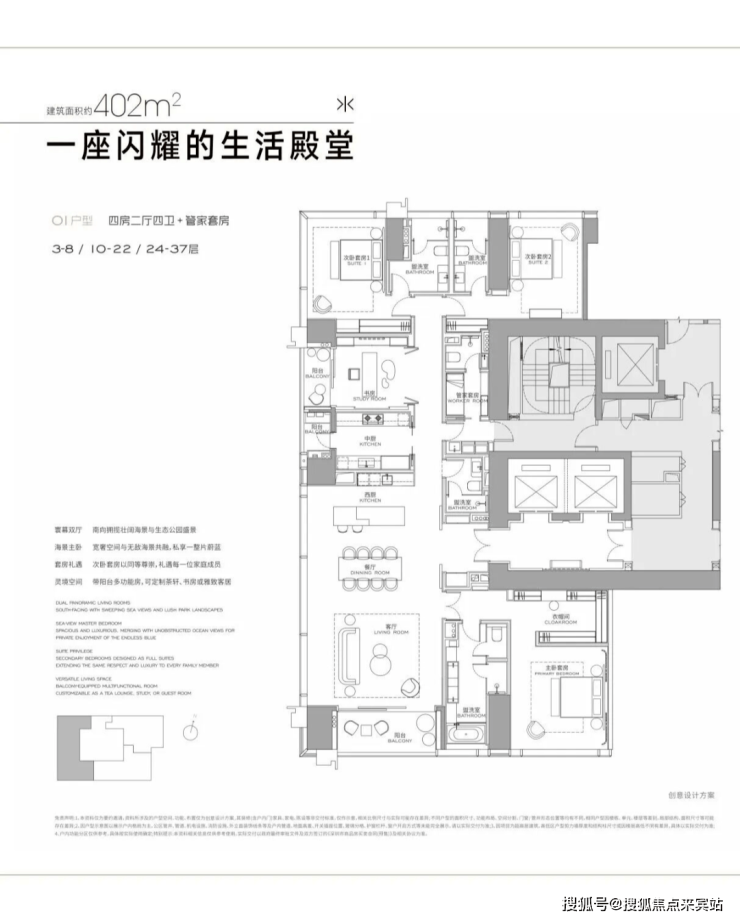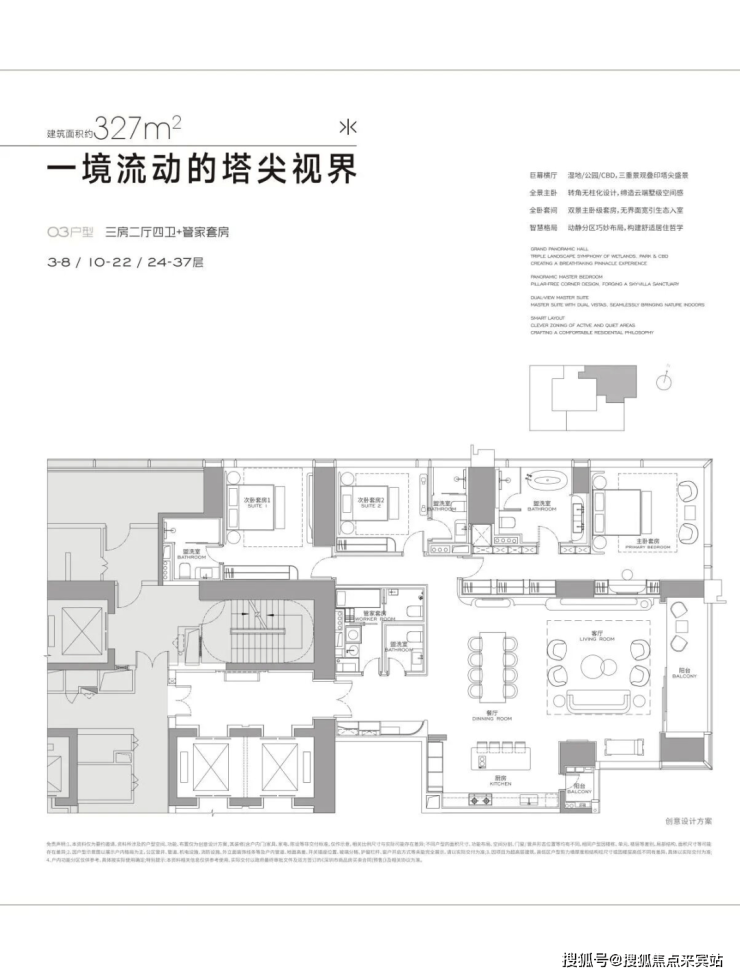 304㎡做2房3卫+家政套间,327㎡做3房4卫+家政套间,402㎡做4房4卫+家政套间,568㎡4+1房五卫+家政套间,1032㎡大平层。