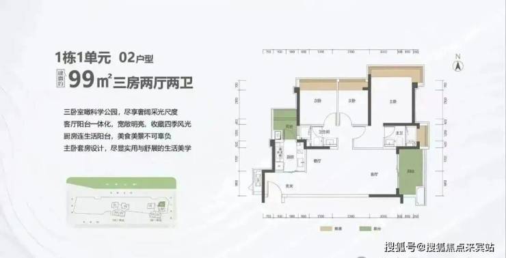 99㎡的3房2厅2卫,1栋1单元02户型,设计的是竖厅格局,客厅3.5米开间,LDKB一体化设计,进深11.31米,动静分区,三卧室朝东北向看科学公园,二字型厨房还带1个生活阳台,公卫三段式分离,阳台1.5米进深,东南朝向。