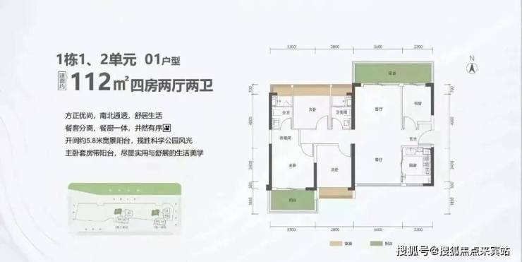 112㎡的4房2厅2卫,1栋1/2单元01户型,设计的是竖厅南北通透格局,进门入户玄关,客厅3.6米开间,餐客分离,餐厨一体设计,四开间朝南,主卧套房带阳台,客厅连接次卧出5.8米长的巨幕大阳台,U型厨房,卫生间干湿分离,阳台主朝东北向看科学公园。