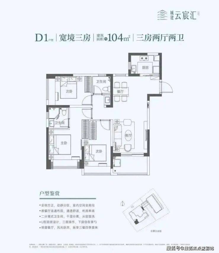 104㎡的3房2厅2卫,设计的竖厅南北通透格局,餐客厅一体化,U型厨房,阳台西南朝向。