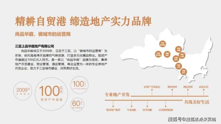 三亚上品华庭地产有限公司成立于2009年,公司实际投入资金约60亿元人民币,现资产市值超过100亿元人民币,已开发项目总面积近百万方。公司以“尚品华庭”品牌为领衔,集房地产开发建设、物业管理、酒店管理、商业运营为一体的专业房地产开发企业。