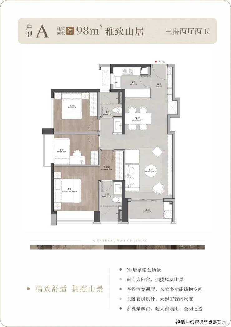 户型背山面海,超大的窗墙比将窗外无价的山海资源揽入户内,所有户型都可以看到开阔的山景,部分户型高楼层可以同时看到山海景观;南向大面宽、小进深,结合现代人家居理念的LDKB一体化设计,打造城市之芯的巨幕山海。