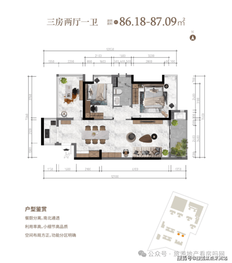 户型1:该户型建面约86.18-87.09㎡,三房两厅格局。餐厨分离,南北通透,利用率高,小细节高品质,空间布局方正,功能分区明确。