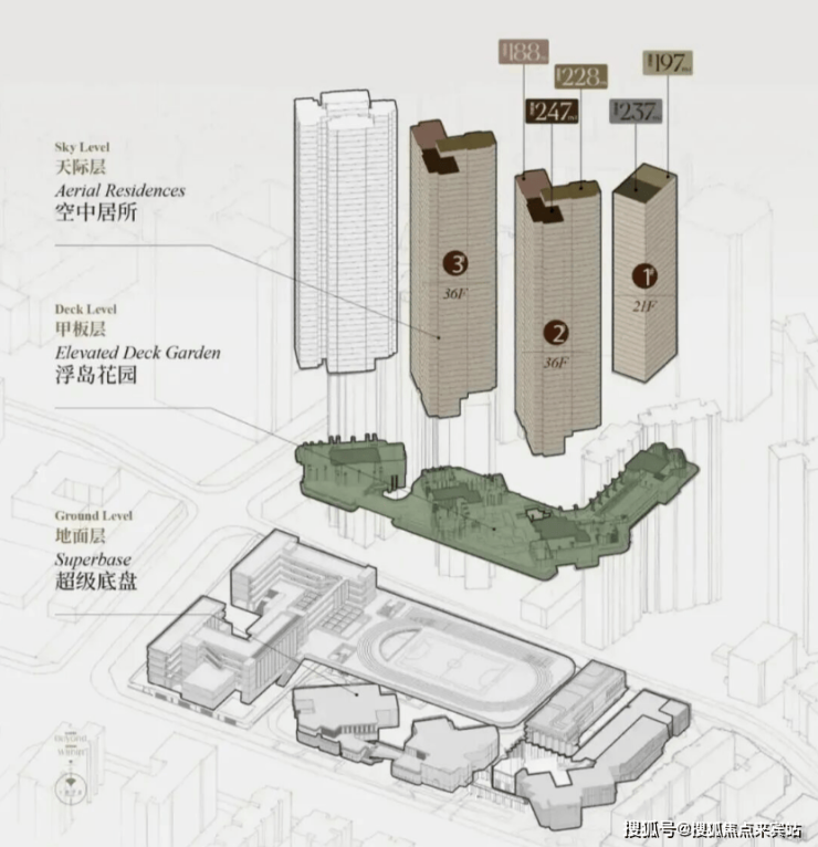项目住宅设计采用“浮岛甲板”设计策略,四栋住宅落于甲板之上,独享甲板庭院花园。进而形成超级社区底盘+浮岛绿化甲板的垂直共生人居标杆。