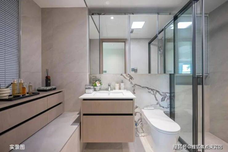 例如,在创意空间中,有一处设计尤为巧妙,主卫的镜柜中,嵌入了恒温美妆冰箱,可以收纳护肤品、香水、面膜等,恰好触达女性最在意的细节,让人一眼心动。
