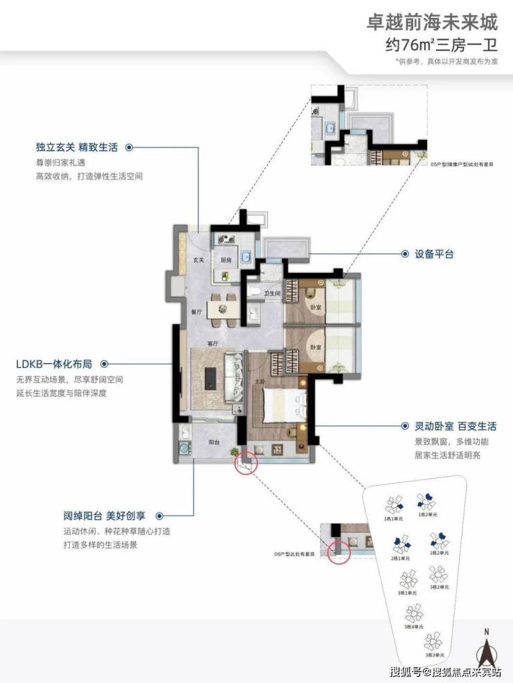 76㎡的3房2厅1卫,设计的是竖厅格局,进门入户玄关,客厅3.05米开间,LDKB一体化,S墙设计预留冰箱位,3个卧室分别做到了2.95米/2.3米/2.15米的宽度,U型厨房,前海未来城售楼处电话☎:400-150-5057卫生间三段式分离,还带1个设备平台可以使用,得房率约:89%(包含赠送),阳台有朝东北、东南或西南向