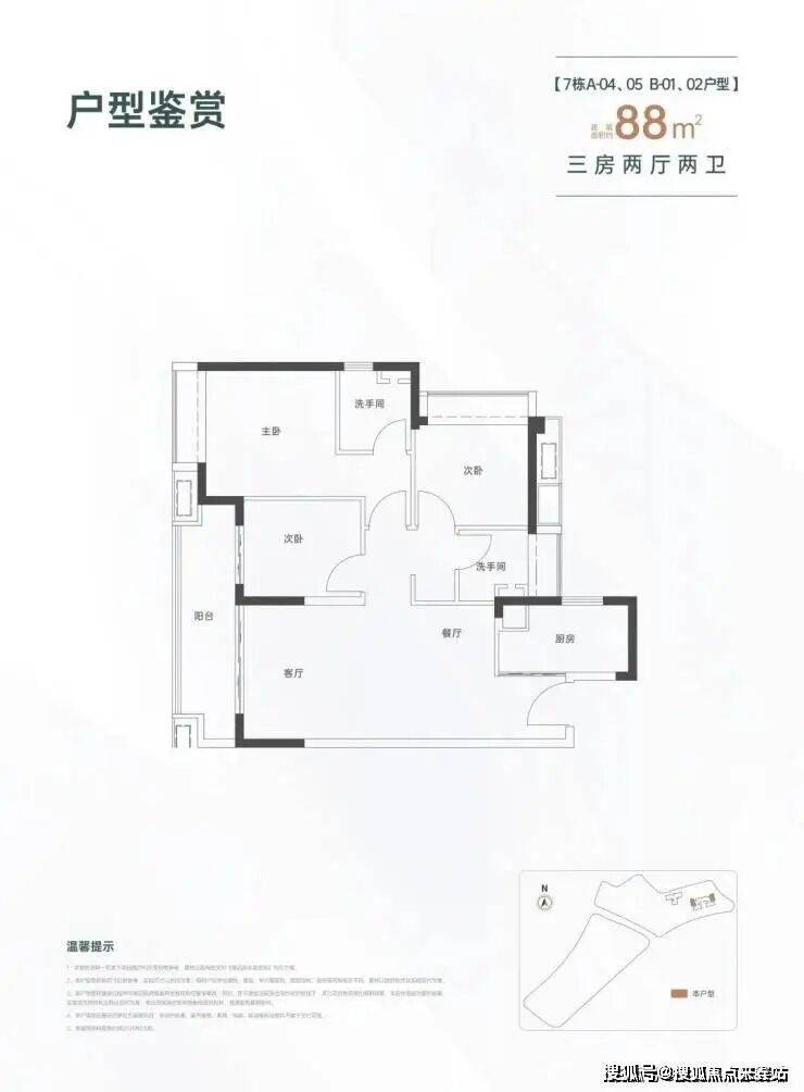 88㎡的3房2厅2卫,设计的是经典竖厅格局,进门入户玄关,LDKB一体化设计,动静分区,客厅连接次卧出大阳台,L型厨房,公卫三段式分离,得房率约82%(不含赠送),西南或东北朝向。