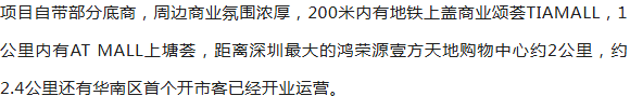 距离深圳最大的商场龙华壹方天地购物中心约2公里,距离天虹购物中心约2.6公里,可满足购物休闲娱乐需要。