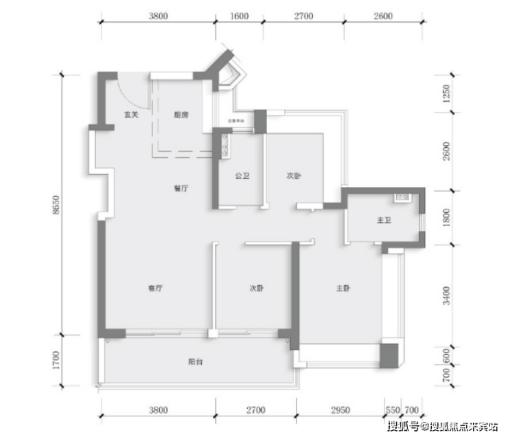 【88㎡3房2厅2卫】:经典的竖厅结构,动静分区。