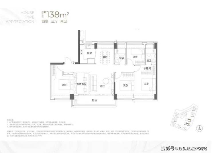 东南或西南朝向以及西北朝向,有3种户型格局,但整体差异并不大,都是横厅设计,阳台也都非常宽敞。主要核心区别是阳台的设计,这应该是为了贴合楼栋朝向、景观所做的调整。建面约138㎡4房2卫