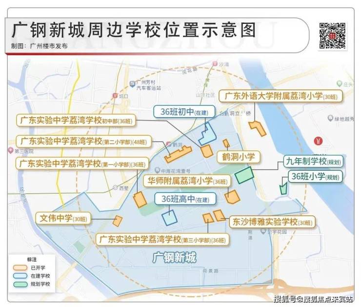 一路之隔就是广东实验中学荔湾学校第三小学部(简称“省实三小”,已于2022年9月开学);项目自身配建2所中小学,其中一间已确定为省级名校:广东省实验初中,预计2025年竣工;板块将形成32所学校集群,小学到高中一站式全龄教育唾手可得,打造15分钟教育圈。