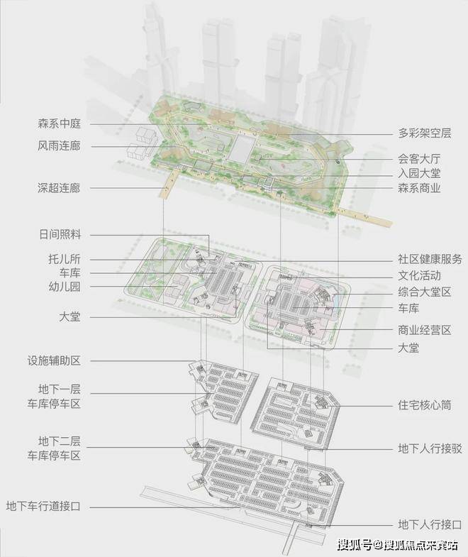 在垂直维度打造了一套过度城市与住区的 “城市甲板” 系统:将城市商业,社区配套服务,文化活动等置于底层,以模糊的边界与公共的功能布局与城市相连。