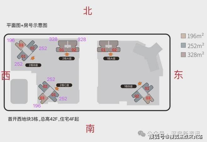 中海深湾胤府共由7座主体楼组成,其中,1A栋、1B栋、2A栋、2B栋、2C栋是可售的商品房住宅楼,有4梯3户和3梯2户两种梯户比;1C栋是开发商自持的公共租赁住宅楼,为8梯8户;3栋是9班幼儿园教学楼。