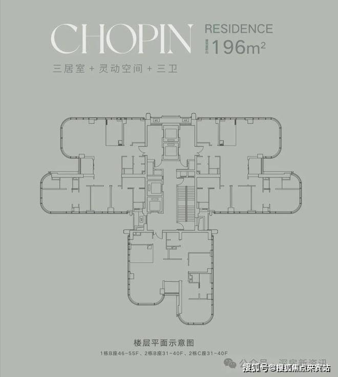 设计基于总图逻辑展开,为了能满足6.0高容积率数据指标,最终以3栋T3 (一梯三户) ,2栋T2 (一梯二户) ,1栋相对独立的 “三芒星” 平面高梯户比垂直社区 (业主自持) ,共6栋住宅便实现。