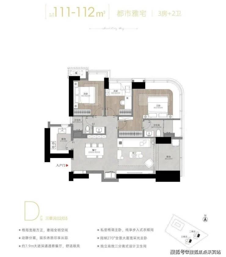 02/03 D户型——建面约111-112㎡3房2卫 :经典竖厅户型,东南朝向,看城市景观。户型格局方正,全明设计。客厅拥有约3.45米开间,与餐厅、阳台一体化连通,空间感开阔。主卧区是亮点,约23㎡包含步入式衣帽间和干湿分离主卫,并享有270°采光。