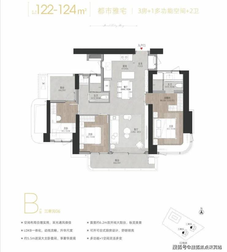 06 B户型——建面约122-124㎡3+1多功能空间 : 双龙抱珠户型,次卧带阳台。西北朝向看绿地公园及花园。虽然是125㎡户型中总价最低的,但仍保持高标准的空间尺度和配置,适合注重实用性的改善家庭,属于性价比之王。