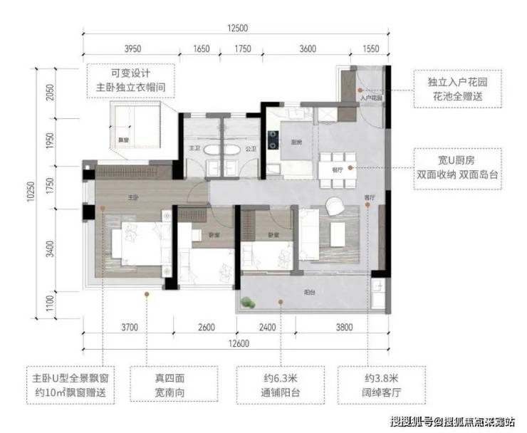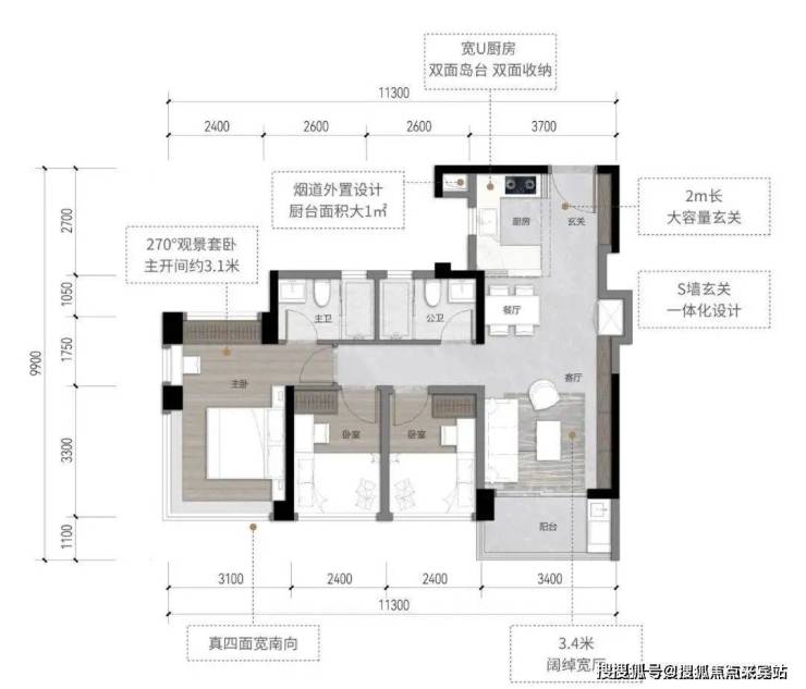 88㎡三房:7.3米全景阳台,餐厨一体化空间,270°转角主卧,独立入户花园。