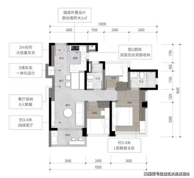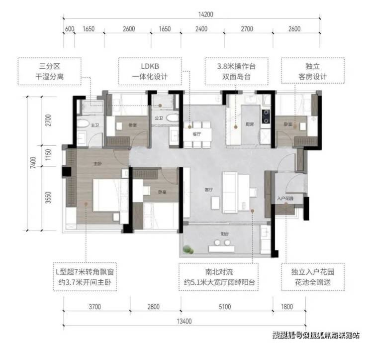 77㎡三房:东南朝向稀缺户型,次卧与客厅可变空间,主卧带L型全景飘窗,LDKB一体化设计。