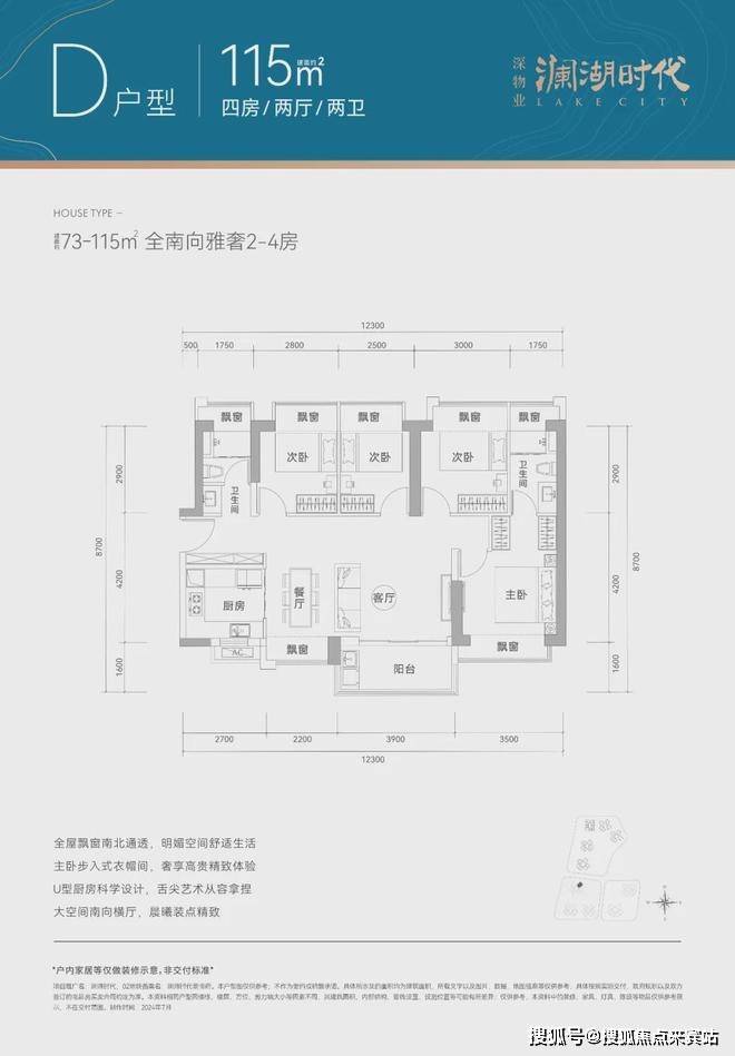 115㎡的4房2厅2卫,设计的是横厅南北通透格局,仅1单元01户型才有,客餐厅一体化6.1米开间,4个卧室分别做到了3.5米/3米/2.8米/2.5米的宽度,主卧套间设计,U型厨房,公卫三段式分离,得房率77-78%(不含赠送),阳台主朝东南向。