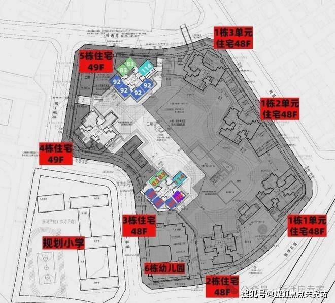 项目共由7栋48-49层高住宅组成,分为二期开发,一期为1栋1/2/3单元住宅48F,2栋住宅48F;二期为3住宅48F,4/5栋住宅49F;6栋是1所12班制幼儿园