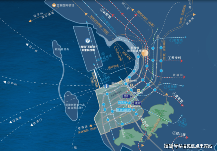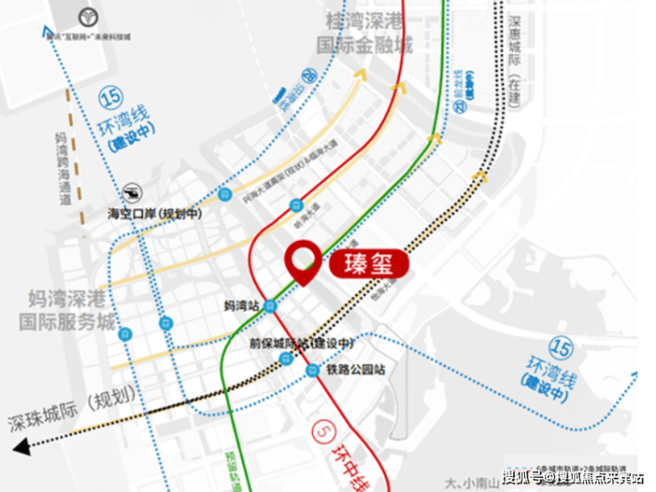 瑧玺周边共规划6条地铁线、2条城际轨道、1条妈湾跨海隧道及1个海空口岸。