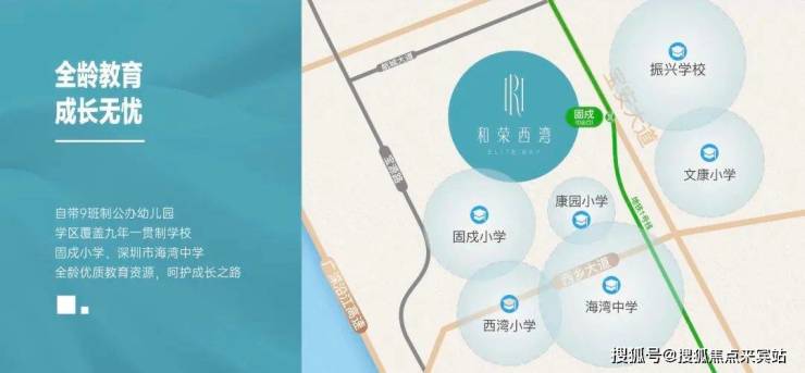 项目自带9班制公办幼儿园,学区覆盖九年一贯制固戍小学、深圳市海湾中学,启航精英人生路