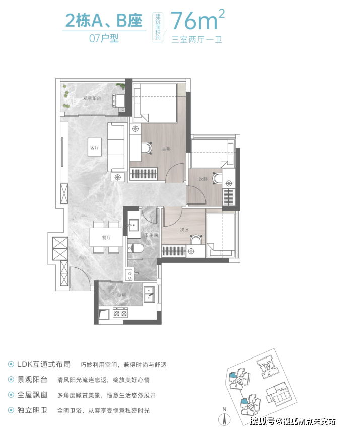 ③建面约76㎡是竖厅三房两厅一卫户型,结构比较传统,功能间布局合理,实用性比较强,比较适合预算有限的刚需家庭,预计这个户型会比较抢手。