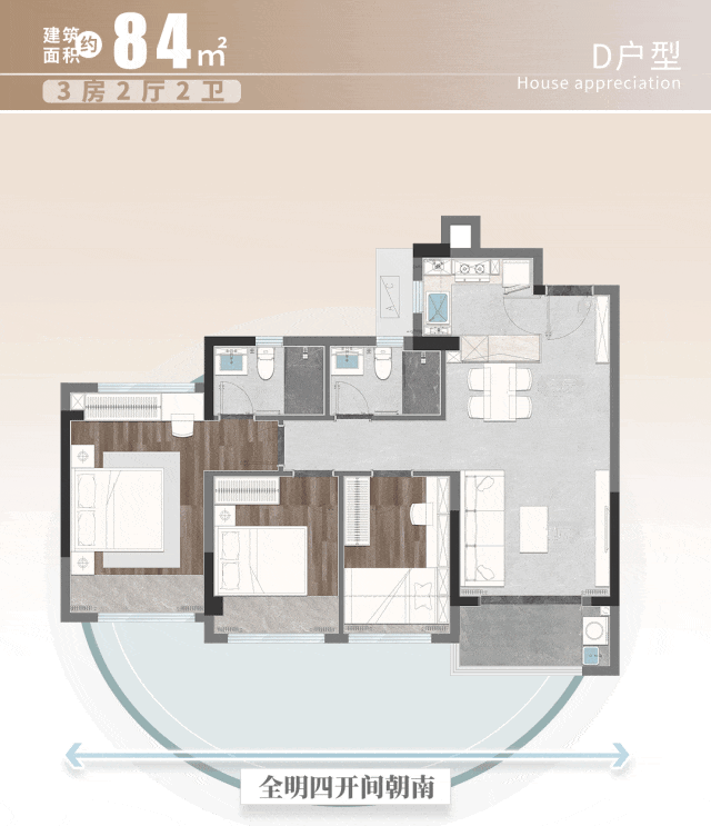 建面约84㎡3房两厅两卫,产品力也不容小觑。