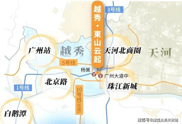 越秀东山云起区位优势突出,位于中山一立交西侧,紧邻珠江新城,占据老东山核心区位,集越秀、天河双核心资源。交通方面,周边现有地铁 1 号线 / 5 号线杨箕站(直线 700 米)、5 号线五羊邨站(800 米)、1 号线 / 3 号线体育西路站(800 米),在建 10 号线广州大道中站(2025 年通车,步行 400 米)通车后,将形成三地铁覆盖格局;自驾方面,周边东风东路、中山一路、内环路、广州大道中等主干道环绕,中山一立交衔接主城区,15-20 分钟可覆盖越秀、天河大部分区域,通勤高效。