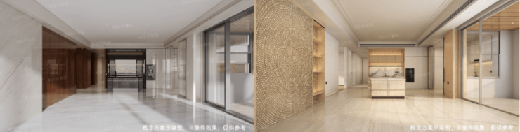 首层谧邸之厅:采用围合式庭院设计,阔绰车马院与酒店式落客区以从容礼序迎接归家,营造出私密而尊贵的入户体验。