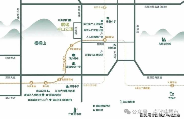 项目距8/2号线深外高中站直线距离约700m,直达罗湖福田,武深高速、惠深沿海高速、东部过境高速,盐田金色海岸码头,东部通航直升机主运行基地,执掌轨路海空多维交通,迭新城市极速生活圈。