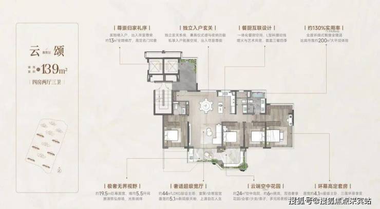 约 138㎡:4 房 2 卫,横厅 + 观景阳台,主卧套间带步入式衣帽间,部分高层享一线江景/城市天际线。