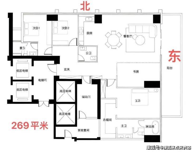 269㎡四房三卫+家政套间户型估计二娃居家优选,双套间+主仆双动线设计,尤其适合需要多储物空间,以及习惯有住家保姆的需求。
